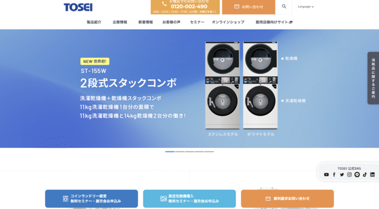 TOSEIは国内屈指の業務用洗濯・乾燥機メーカーで、コインランドリー機器に強みを持つ企業です。コインランドリー経営をサポートする設備と運営支援を提供しています。 TOSEIの特徴・差別化要素 国産設計・製造と長…