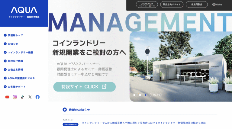 AQUAは世界的な家電・洗濯機器メーカーで、コインランドリー向けに高効率・省エネの洗濯乾燥機を提供し、信頼性の高いブランドとして展開しています。 AQUA(アクア)の特徴・差別化要素 高性能・省エネ設計の洗濯…