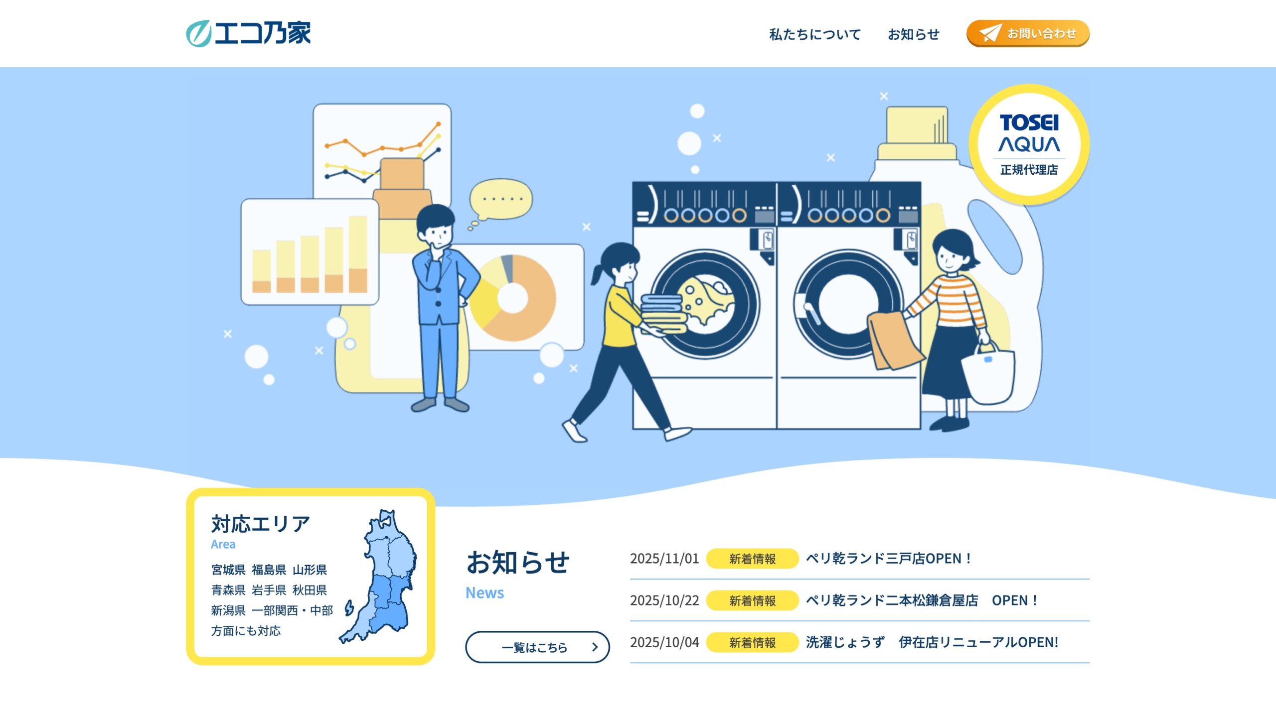 株式会社エコ乃家は、主に東北〜北関東を対象に、コインランドリーの物件紹介・店舗開発・機器提供から運営支援までを手がける総合サポート企業。出店支援と既存店の改善支援をワンストップで行っています。