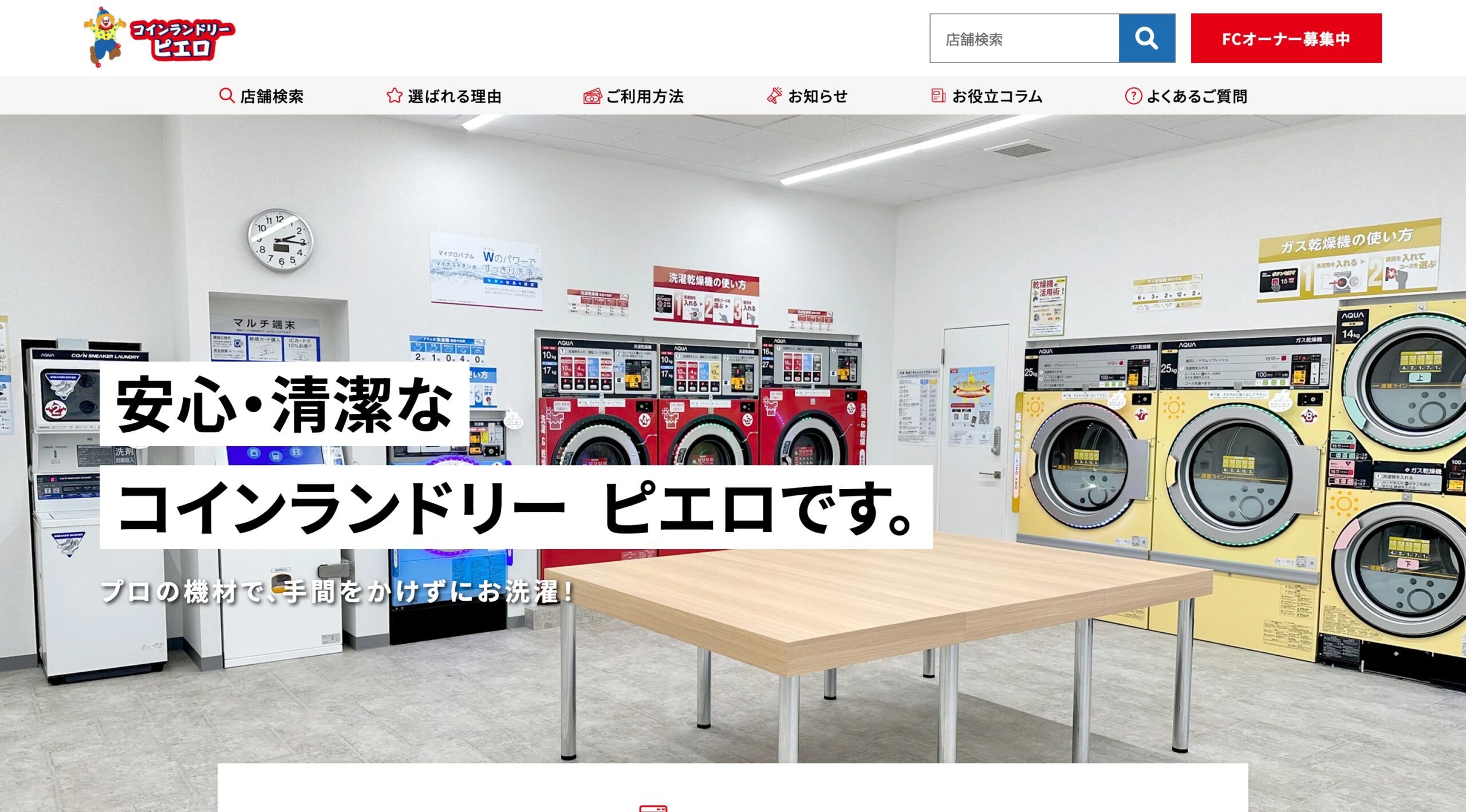 コインランドリー ピエロは、マイナスイオン水+40℃温水洗浄・大型機の設置・24時間営業などを特徴とし、全国展開するコインランドリーフランチャイズです。